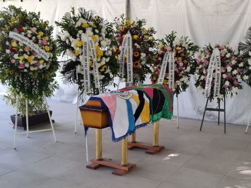Momentos antes da cremação, uma bandeira da Estação Primeira de Mangueira e outra da LIESA cobriram o esquife do sambista, numa manifestação de carinho, respeito e admiração de toda a Família do Samba.