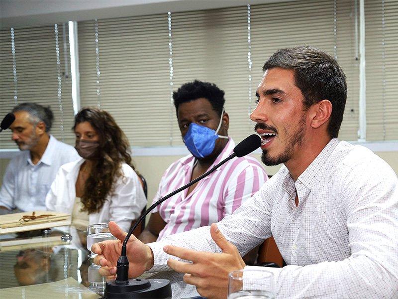 Fred e Alice Gelli, Gabriel e André Marques apresentam uma das variações da marca aos jornalistas