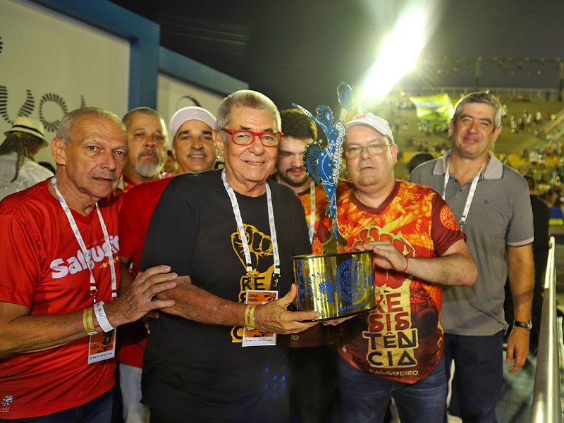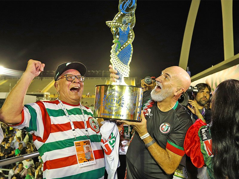 O presidente André Vaz, à esquerda, compartilha a alegria de um bom desfile do Salgueiro