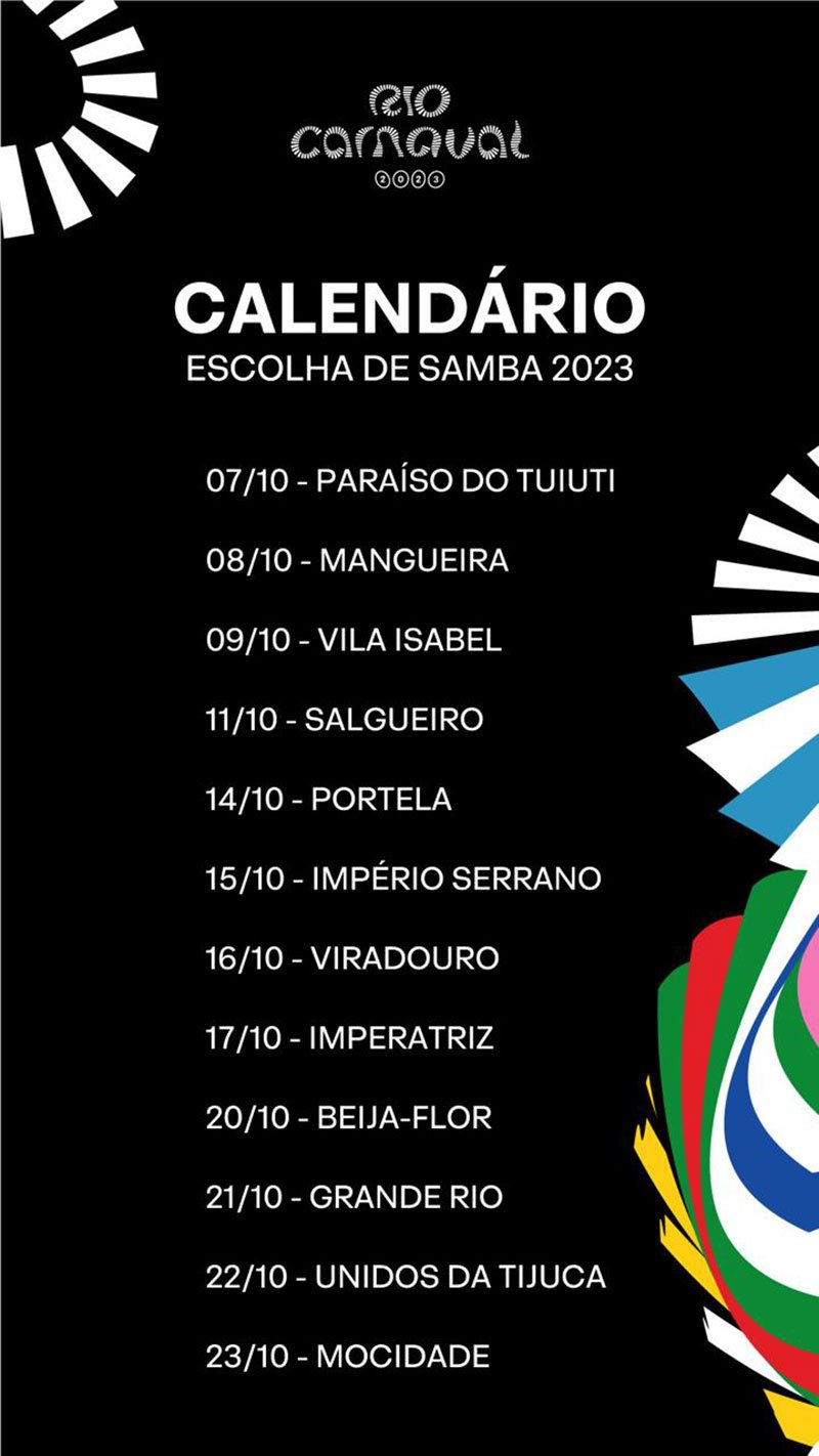 Ao longo de todo o mês de outubro, sobretudo aos fins de semana, as Escolas de Samba do Grupo Especial vão abrir as portas de suas quadras para escolher os sambas de enredo para o RIO CARNAVAL 2023. O calendário oficial com as escolhas inclui datas específicas para os eventos promovidos por cada uma das 12 Agremiações.