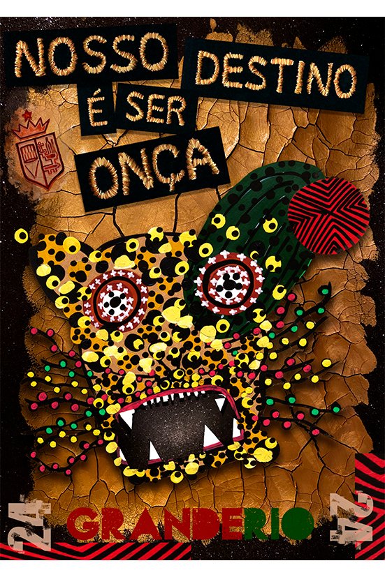 Ocupando posição central nas narrativas míticas dos povos tão complexos que desenharam os contornos do litoral do Brasil e se conectavam tanto ao coração da Amazônia quanto às demais sociedades ameríndias do que hoje se entende por latinoamérica, eis o signo deste enredo: a onça. Metáfora viva dos rituais antropofágicos, é a onça uma chave para que sejam pensadas as disputas identitárias brasileiras e a nossa eterna capacidade de devorar para recriar – e renascer, rebrotar, revidar, deglutir. Insurgência e potência! Mais do que o animal em si, o bicho, a ideia de “devoração” - jaguara. O ser divino, sagrado, que ergueu reinos, em nosso imaginário. Bordou de força e bravura as narrativas de matriz oral dos povos originários, as lendas costuradas em folguedos e canções, os cordéis do motor Armorial, o próprio carnaval do Rio de Janeiro, em algumas de suas melhores apresentações. Hoje, expressa as lutas de muitas gentes – e, com os dentes e as garras à mostra, há de expressar, também, a vitória da Grande Rio!