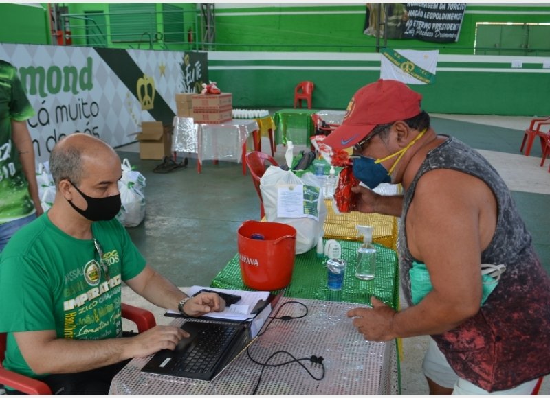 Os beneficiados estavam cadastrados e foram à quadra para fazer a retirada dos produtos em hora marcada, seguindo os protocolos de segurança, em virtude da pandemia.