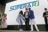 Ao lado do presidente da ALERJ, deputado André Ceciliano, o governador chamou ao palco Jaqueline de Oliveira Silva, a primeira cidadã a receber o cartão do Supera-RJ. Logo depois, mais 20 beneficiados ganharam os seus cartões do auxílio.