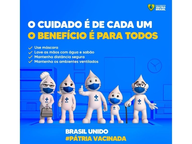 Para participar da ação, o Zé Gotinha, ícone das campanhas de vacinação no País volta à cena, acompanhado de toda a família Gotinha: Dona Gotinha (avó), o Sr. Gotinha (avô), o filho Gotinha Jr., e a esposa do personagem principal, a Maria Gotinha! Com o conceito “O cuidado é de cada um; o benefício é para todos”, a campanha também reforçará que o Brasil está unido por uma #PátriaVacinada.