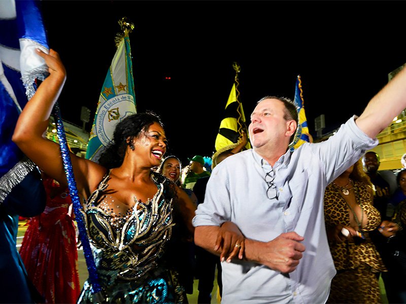 De braços com a porta-bandeira Selminha Sorriso, Paes desfila na Avenida iluminada