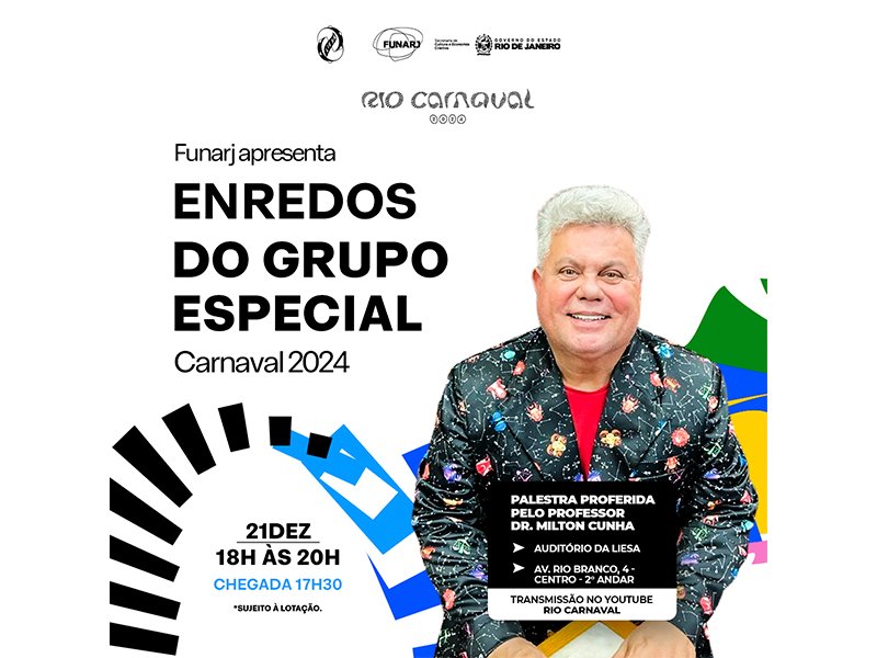 18.12.2023O comentarista Milton Cunha convida a imprensa e público interessado na folia, para um encontro especial no dia 21 de dezembro, às 17h30, no auditório da Liesa (Av. Rio Branco, 4, 2º andar - Centro). Na ocasião, será realizada a palestra "Enredos", onde destrinchará os 12 temas que as escolas de samba do Rio Carnaval levarão para a Marquês de Sapucaí nos desfiles de 2024 do Grupo Especial carioca, com direito a análises aprimoradas com base nos contextos históricos, culturais e de representatividade.